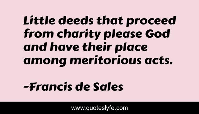 This page presents the quote "Little deeds that proceed from charity please God and have their place among meritorious acts.". Author of this quote is Francis de Sales. This quote is about god, charity, humility,.