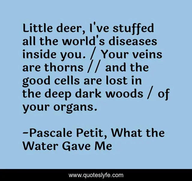 This page presents the quote "Little deer, I've stuffed all the world's diseases inside you. / Your veins are thorns // and the good cells are lost in the deep dark woods / of your organs.". Author of this quote is Pascale Petit, What the Water Gave Me. This quote is about what-the-water-gave-me, frida-kahlo, painting, poetry, little-deer,.