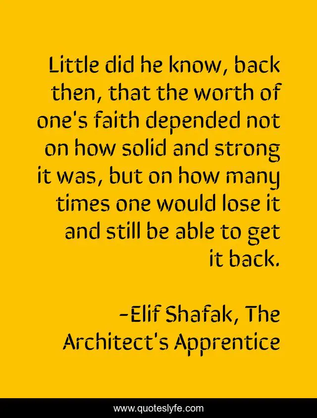 This page presents the quote "Little did he know, back then, that the worth of one's faith depended not on how solid and strong it was, but on how many times one would lose it and still be able to get it back.". Author of this quote is Elif Shafak, The Architect's Apprentice. .