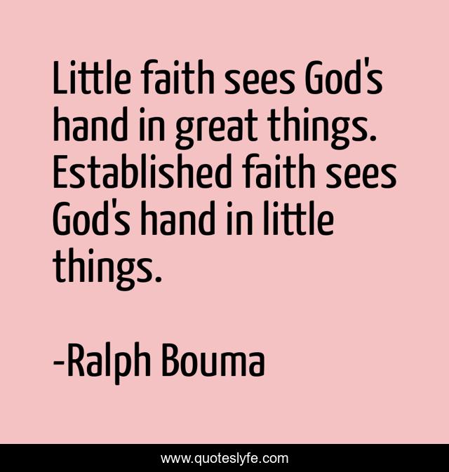 This page presents the quote "Little faith sees God's hand in great things. Established faith sees God's hand in little things.". Author of this quote is Ralph Bouma. This quote is about faith, doubt,.