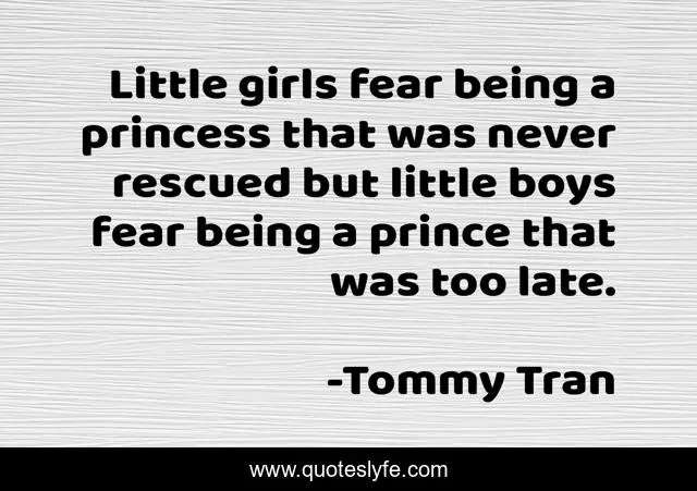This page presents the quote "Little girls fear being a princess that was never rescued but little boys fear being a prince that was too late.". Author of this quote is Tommy Tran. This quote is about relationships, true-love, love, god, men, prince, romance, princess, affection,.