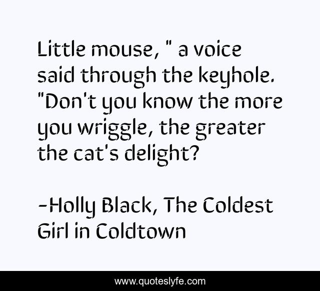 This page presents the quote "Little mouse, " a voice said through the keyhole. "Don't you know the more you wriggle, the greater the cat's delight?". Author of this quote is Holly Black, The Coldest Girl in Coldtown. This quote is about beautiful, dark, literature, vampires, ya, the-coldest-girl-in-coldtown, gavriel, holly-black, romance,.