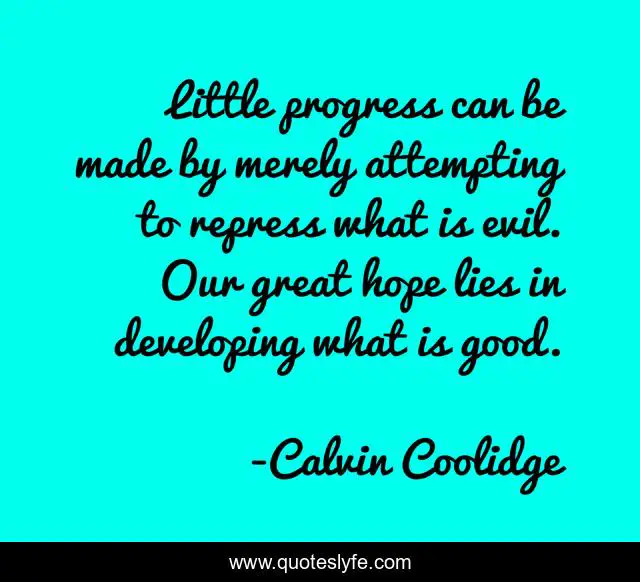 This page presents the quote "Little progress can be made by merely attempting to repress what is evil. Our great hope lies in developing what is good.". Author of this quote is Calvin Coolidge. This quote is about great, good, evil,.