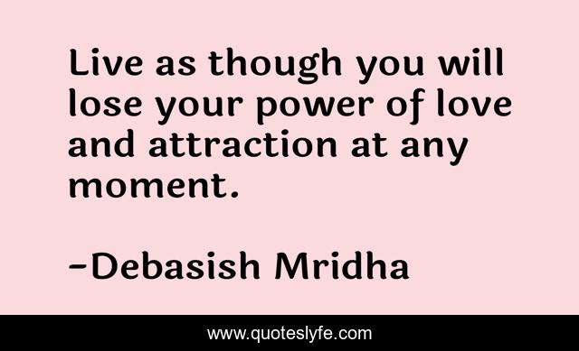 This page presents the quote "Live as though you will lose your power of love and attraction at any moment.". Author of this quote is Debasish Mridha. This quote is about miraboli, oscar-wilde, philosophy, debasish-mridha, power-of-love, live-every-moment, quotes, debasish-mridha-md, inspirational,.