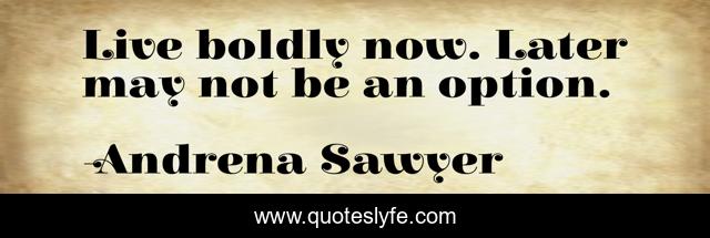 This page presents the quote "Live boldly now. Later may not be an option.". Author of this quote is Andrena Sawyer. This quote is about courage, boldness-and-attitude, death, life, entrepreneurship,.
