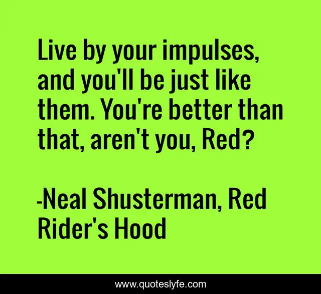 This page presents the quote "Live by your impulses, and you'll be just like them. You're better than that, aren't you, Red?". Author of this quote is Neal Shusterman, Red Rider's Hood. This quote is about better, impulses, life, live, better-person,.