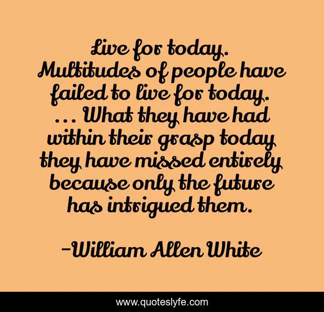 This page presents the quote "Live for today. Multitudes of people have failed to live for today. ... What they have had within their grasp today they have missed entirely because only the future has intrigued them.". Author of this quote is William Allen White. .