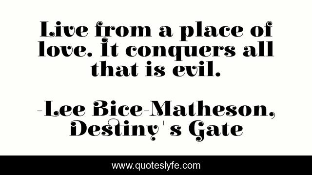 This page presents the quote "Live from a place of love. It conquers all that is evil.". Author of this quote is Lee Bice-Matheson, Destiny's Gate. This quote is about fantasy-adventure, spiritual, j-r-matheson, lee-bice-matheson, paranormal, ghosts, destiny-s-gate, paige-maddison-series,.