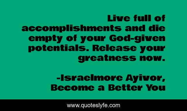 This page presents the quote "Live full of accomplishments and die empty of your God-given potentials. Release your greatness now.". Author of this quote is Israelmore Ayivor, Become a Better You. This quote is about inspirations, accomplishments, live-full, die-empty, food-for-thought, accomplish, do-it-yourself, positive, live,.