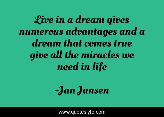 This page presents the quote "Live in a dream gives numerous advantages and a dream that comes true give all the miracles we need in life". Author of this quote is Jan Jansen. .