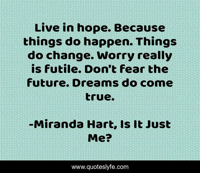 This page presents the quote "Live in hope. Because things do happen. Things do change. Worry really is futile. Don't fear the future. Dreams do come true.". Author of this quote is Miranda Hart, Is It Just Me?. This quote is about enthusiasm, future, dreams, inspirational,.