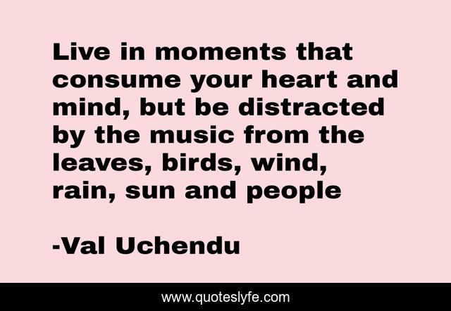 This page presents the quote "Live in moments that consume your heart and mind, but be distracted by the music from the leaves, birds, wind, rain, sun and people". Author of this quote is Val Uchendu. This quote is about heart, people, moments, sun, leaves, mind, music, bird, rainy-day,.