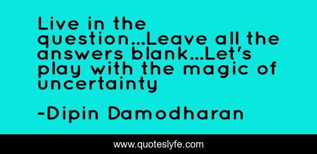 This page presents the quote "Live in the question...Leave all the answers blank...Let's play with the magic of uncertainty". Author of this quote is Dipin Damodharan. This quote is about uncertainty-in-life, life, depression,.
