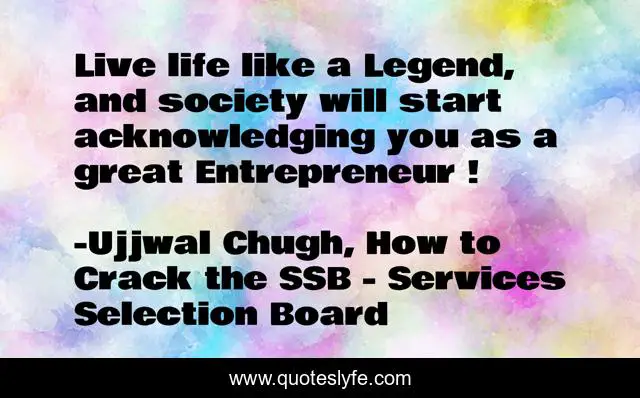 This page presents the quote "Live life like a Legend, and society will start acknowledging you as a great Entrepreneur !". Author of this quote is Ujjwal Chugh, How to Crack the SSB - Services Selection Board. This quote is about youthful-optimism, confidence, positive, motivational, entrepreneurship, entrepreneur, optimistic, inspirational, enthusiasm,.