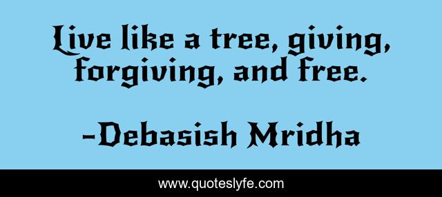 This page presents the quote "Live like a tree, giving, forgiving, and free.". Author of this quote is Debasish Mridha. This quote is about life, love, knowledge, happiness, giving, intelligence, philosophy, free, wisdom,.