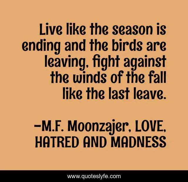 This page presents the quote "Live like the season is ending and the birds are leaving, fight against the winds of the fall like the last leave.". Author of this quote is M.F. Moonzajer, LOVE, HATRED AND MADNESS. This quote is about like, season, fight, live, fall, leaving, birds,.