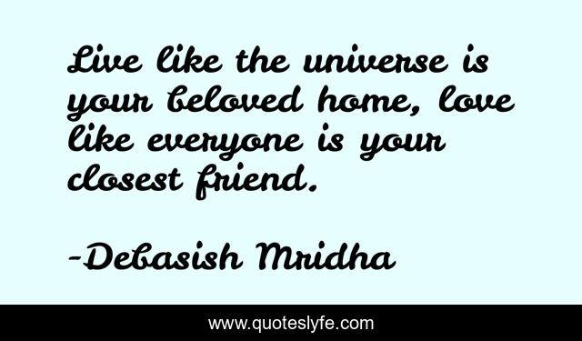 This page presents the quote "Live like the universe is your beloved home, love like everyone is your closest friend.". Author of this quote is Debasish Mridha. This quote is about life, love, knowledge, inspirational, intelligence, philosophy, wisdom, quotes, affection,.