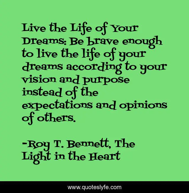 This page presents the quote "Live the Life of Your Dreams: Be brave enough to live the life of your dreams according to your vision and purpose instead of the expectations and opinions of others.". Author of this quote is Roy T. Bennett, The Light in the Heart. This quote is about motivation, brave, inspire, optimistic, inspirational-life, life-and-living, living, inspiring, positive,.