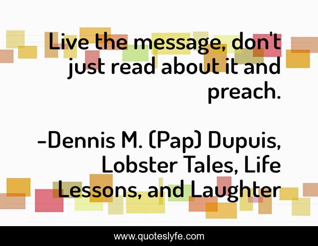 This page presents the quote "Live the message, don't just read about it and preach.". Author of this quote is Dennis M. (Pap) Dupuis, Lobster Tales, Life Lessons, and Laughter. This quote is about fun, humor,.