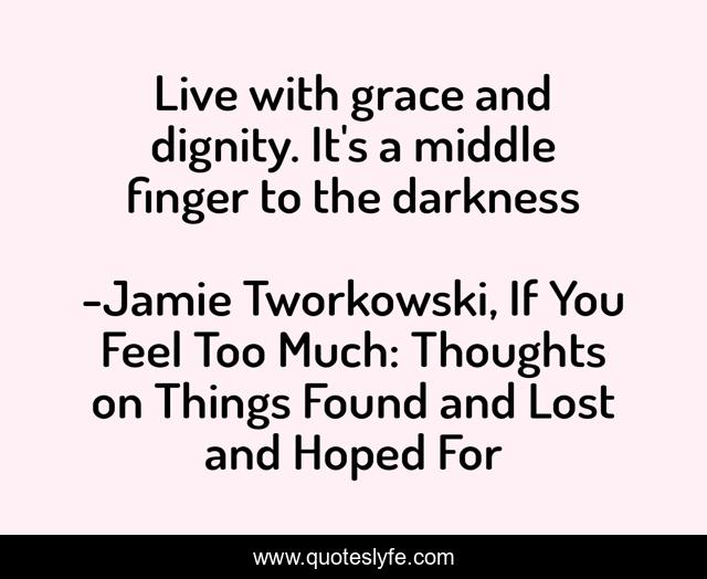 This page presents the quote "Live with grace and dignity. It's a middle finger to the darkness". Author of this quote is Jamie Tworkowski, If You Feel Too Much: Thoughts on Things Found and Lost and Hoped For. This quote is about dignity, depression, grace, inspirational, enthusiasm,.