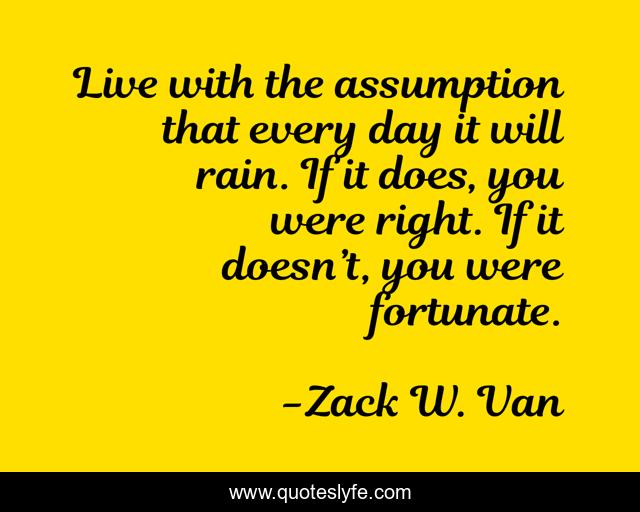 This page presents the quote "Live with the assumption that every day it will rain. If it does, you were right. If it doesn’t, you were fortunate.". Author of this quote is Zack W. Van. This quote is about enthusiasm, inspirational, optimism, silver-lining,.