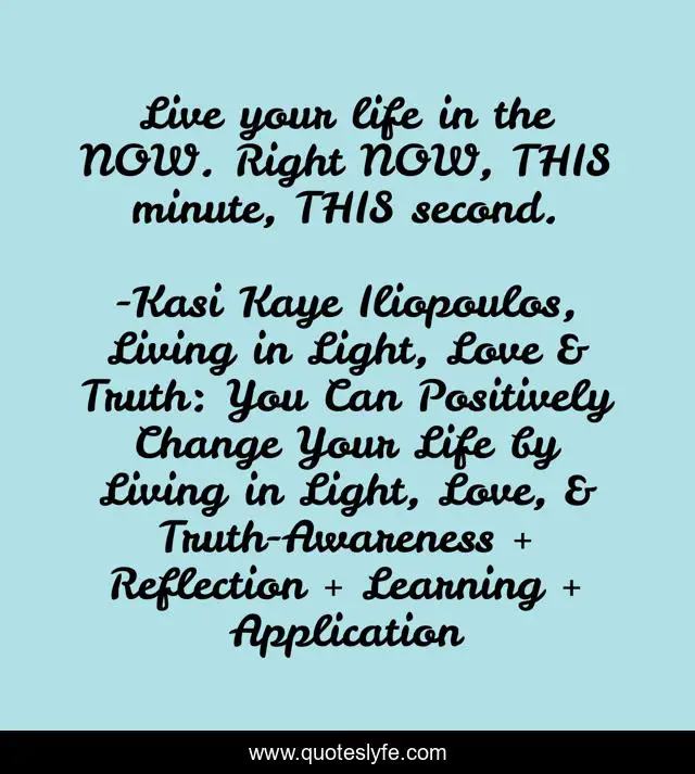 "Kasi Kaye Iliopoulos, Living in Light, Love & Truth: You Can Positively Change Your Life by Living in Light, Love, & Truth-Awareness + Reflection + Learning + Application Quotes." Quoteslyfe.com, 2025. Fri. 05 Dec. 2025. <https://www.quoteslyfe.com/quote/Live-your-life-in-the-NOW-Right-125488>.