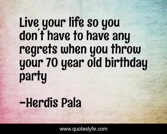 This page presents the quote "Live your life so you don´t have to have any regrets when you throw your 70 year old birthday party". Author of this quote is Herdis Pala. This quote is about confidence, live-life, inspirational, positive, motivational, birthday, optimistic, birthday-party, enthusiasm,.
