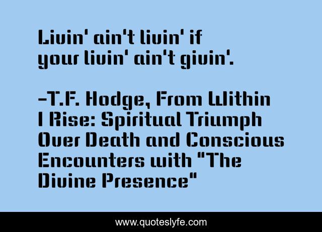 This page presents the quote "Livin' ain't livin' if your livin' ain't givin'.". Author of this quote is T.F. Hodge, From Within I Rise: Spiritual Triumph Over Death and Conscious Encounters with "The Divine Presence". This quote is about living, life, give, gifting,.