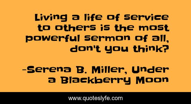 This page presents the quote "Living a life of service to others is the most powerful sermon of all, don't you think?". Author of this quote is Serena B. Miller, Under a Blackberry Moon. This quote is about sermon, service,.