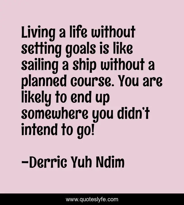 This page presents the quote "Living a life without setting goals is like sailing a ship without a planned course. You are likely to end up somewhere you didn’t intend to go!". Author of this quote is Derric Yuh Ndim. This quote is about thinking, actions, believes, unlocking-your-true-potential, values, inspirational-for-writers, personal-development, inspirational-success-failure, inspiration,.