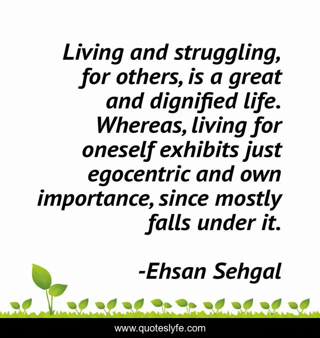 This page presents the quote "Living and struggling, for others, is a great and dignified life. Whereas, living for oneself exhibits just egocentric and own importance, since mostly falls under it.". Author of this quote is Ehsan Sehgal. .