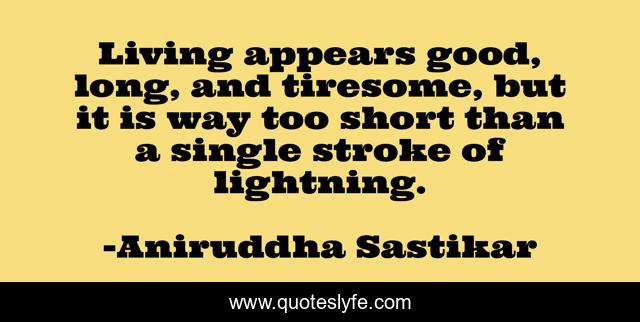 This page presents the quote "Living appears good, long, and tiresome, but it is way too short than a single stroke of lightning.". Author of this quote is Aniruddha Sastikar. This quote is about lightening, life, death, living, long, weary, stroke, short, goodness,.