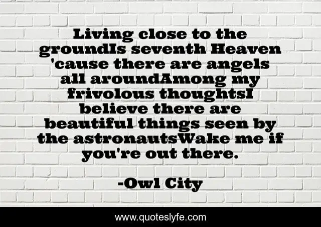 This page presents the quote "Living close to the groundIs seventh Heaven 'cause there are angels all aroundAmong my frivolous thoughtsI believe there are beautiful things seen by the astronautsWake me if you're out there.". Author of this quote is Owl City. This quote is about owl-city, angels,.