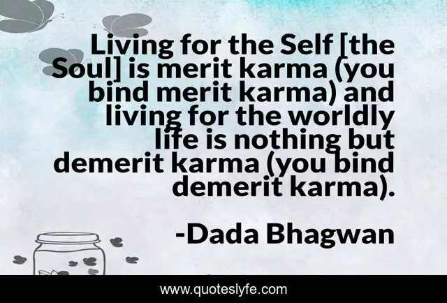 This page presents the quote "Living for the Self [the Soul] is merit karma (you bind merit karma) and living for the worldly life is nothing but demerit karma (you bind demerit karma).". Author of this quote is Dada Bhagwan. This quote is about world, life, living-for-the-self, spiritual, soul,.