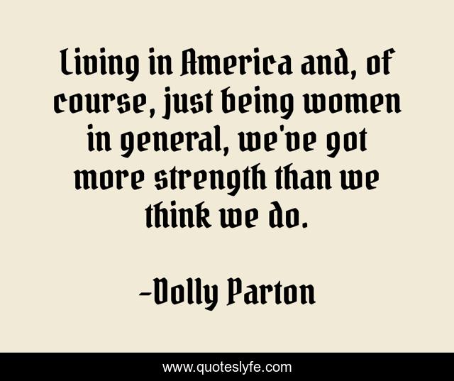 This page presents the quote "Living in America and, of course, just being women in general, we've got more strength than we think we do.". Author of this quote is Dolly Parton. This quote is about america, think, women,.