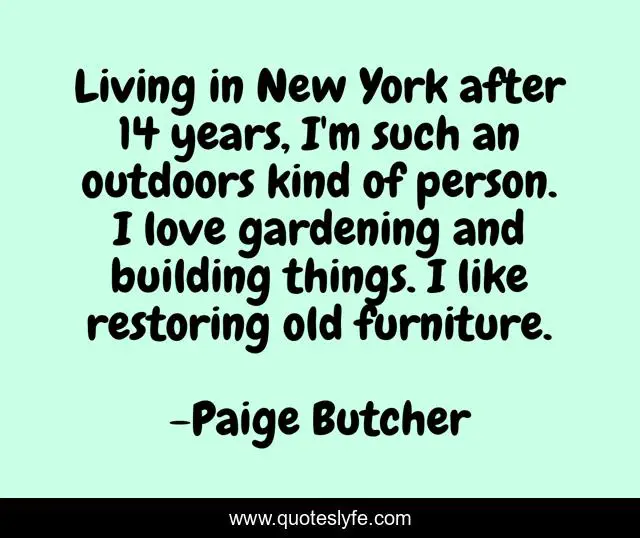 This page presents the quote "Living in New York after 14 years, I'm such an outdoors kind of person. I love gardening and building things. I like restoring old furniture.". Author of this quote is Paige Butcher. This quote is about building, new york, love, affection,.