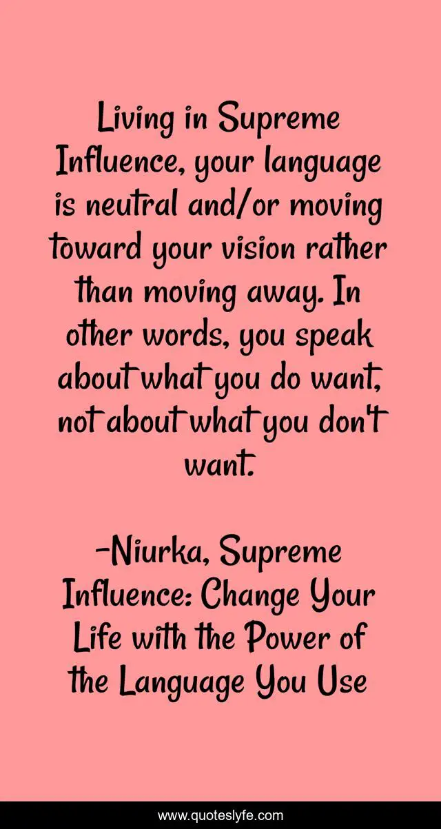 This page presents the quote "Living in Supreme Influence, your language is neutral and/or moving toward your vision rather than moving away. In other words, you speak about what you do want, not about what you don't want.". Author of this quote is Niurka, Supreme Influence: Change Your Life with the Power of the Language You Use. This quote is about life, language, communication, goals, vision, inspiration,.
