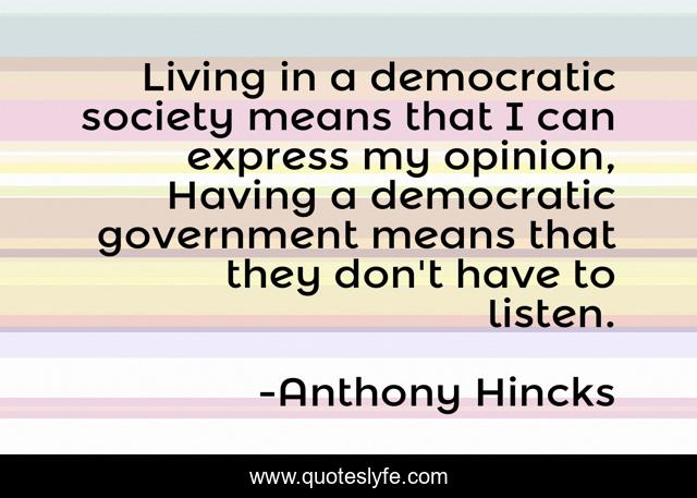This page presents the quote "Living in a democratic society means that I can express my opinion, Having a democratic government means that they don't have to listen.". Author of this quote is Anthony Hincks. This quote is about democracy, government,.