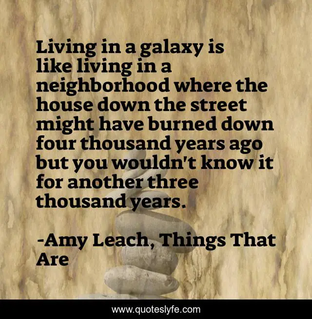 This page presents the quote "Living in a galaxy is like living in a neighborhood where the house down the street might have burned down four thousand years ago but you wouldn't know it for another three thousand years.". Author of this quote is Amy Leach, Things That Are. This quote is about universe, humor, galaxy, stars,.