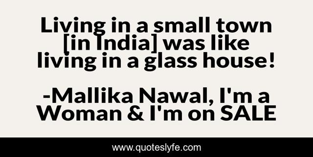This page presents the quote "Living in a small town [in India] was like living in a glass house!". Author of this quote is Mallika Nawal, I'm a Woman & I'm on SALE. This quote is about intrusion, poking-nose, india, glass-house, small-town, intrusive, small-town-life,.