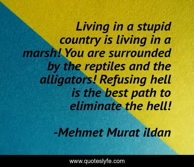 This page presents the quote "Living in a stupid country is living in a marsh! You are surrounded by the reptiles and the alligators! Refusing hell is the best path to eliminate the hell!". Author of this quote is Mehmet Murat ildan. This quote is about refuse, ildan-words-of-wisdom, country, stupid, marsh, path, hell, alligators, reptiles,.