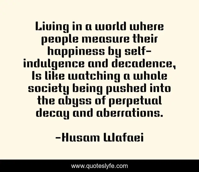 This page presents the quote "Living in a world where people measure their happiness by self-indulgence and decadence, Is like watching a whole society being pushed into the abyss of perpetual decay and aberrations.". Author of this quote is Husam Wafaei. This quote is about self-indulgence, arab, society, civilization, syria, decadence,.