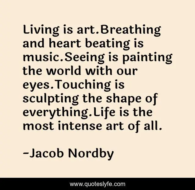 This page presents the quote "Living is art.Breathing and heart beating is music.Seeing is painting the world with our eyes.Touching is sculpting the shape of everything.Life is the most intense art of all.". Author of this quote is Jacob Nordby. This quote is about art, living, life, creativity, creative,.