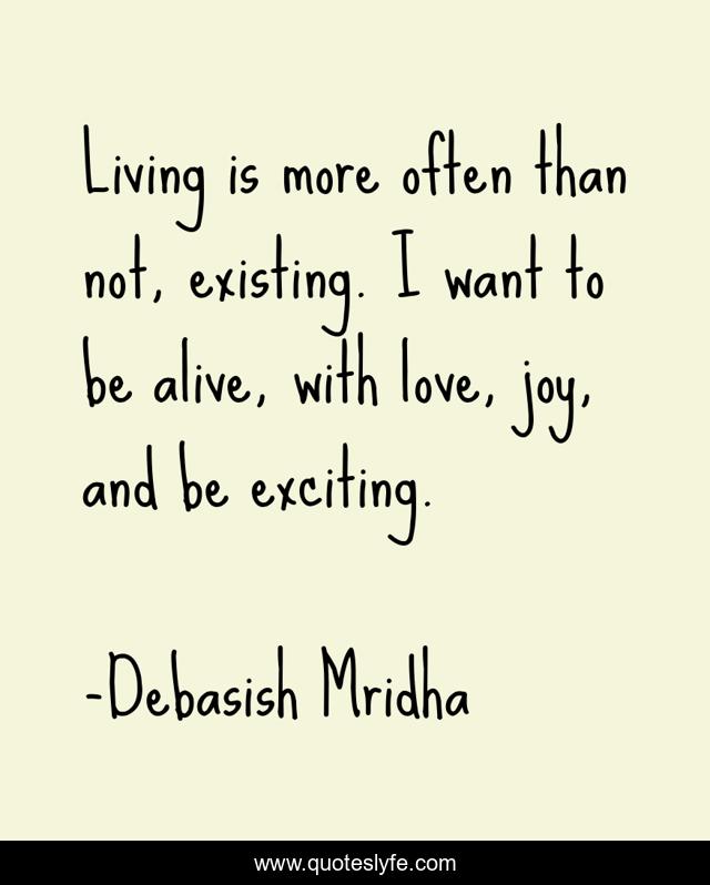 This page presents the quote "Living is more often than not, existing. I want to be alive, with love, joy, and be exciting.". Author of this quote is Debasish Mridha. This quote is about life, love, knowledge, inspirational, intelligence, philosophy, wisdom, quotes, affection,.