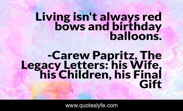 This page presents the quote "Living isn't always red bows and birthday balloons.". Author of this quote is Carew Papritz, The Legacy Letters: his Wife, his Children, his Final Gift. This quote is about carew-papritz, birthday-balloons, quotes, the-legacy-letters, inspirational, quote, red-bows, enthusiasm,.