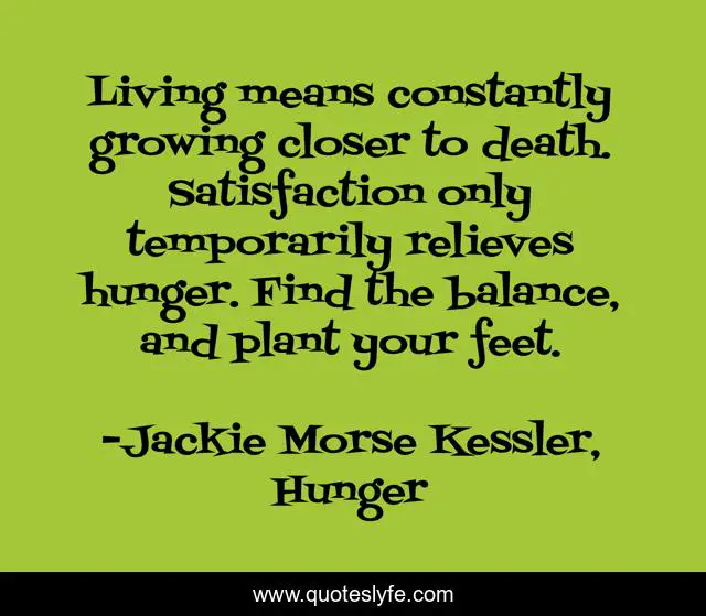 This page presents the quote "Living means constantly growing closer to death. Satisfaction only temporarily relieves hunger. Find the balance, and plant your feet.". Author of this quote is Jackie Morse Kessler, Hunger. This quote is about life, balance, hunger,.
