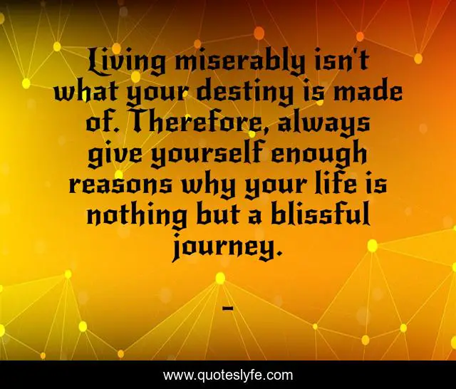 This page presents the quote "Living miserably isn't what your destiny is made of. Therefore, always give yourself enough reasons why your life is nothing but a blissful journey.". Author of this quote is . This quote is about living-miserably, a-blissful-journey, edmond-mbiaka, what-your-destiny-is-made-of, your-life, reasons-to-be-happy,.