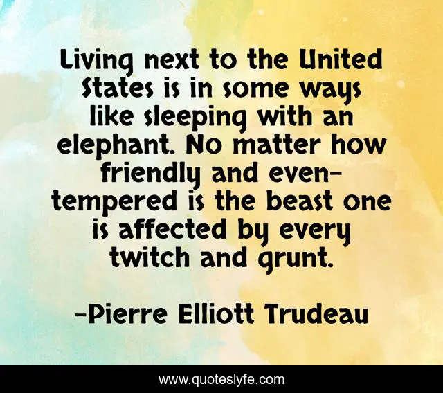 This page presents the quote "Living next to the United States is in some ways like sleeping with an elephant. No matter how friendly and even-tempered is the beast one is affected by every twitch and grunt.". Author of this quote is Pierre Elliott Trudeau. This quote is about canada, canadians,.