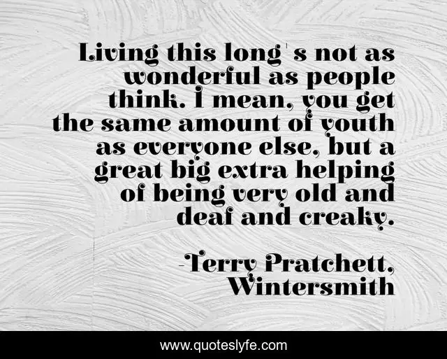 This page presents the quote "Living this long's not as wonderful as people think. I mean, you get the same amount of youth as everyone else, but a great big extra helping of being very old and deaf and creaky.". Author of this quote is Terry Pratchett, Wintersmith. .