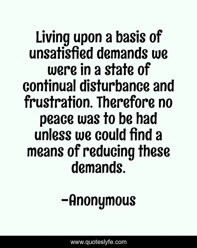 This page presents the quote "Living upon a basis of unsatisfied demands we were in a state of continual disturbance and frustration. Therefore no peace was to be had unless we could find a means of reducing these demands.". Author of this quote is Anonymous. .